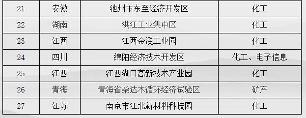 入圍的化工園區(qū)有:上?;瘜W(xué)工業(yè)區(qū)、四川什邡經(jīng)濟(jì)開發(fā)區(qū)、安慶市高新技術(shù)產(chǎn)業(yè)開發(fā)區(qū)、姚家港化工園、宜都高新技術(shù)產(chǎn)業(yè)園、祥云財(cái)富工業(yè)園、連云港徐圩新區(qū)、江西德安工業(yè)園、泰興經(jīng)濟(jì)開發(fā)區(qū)、荊門化工循環(huán)產(chǎn)業(yè)園、江西新干工業(yè)園、貴州福泉經(jīng)濟(jì)開發(fā)區(qū)、池州市東至經(jīng)濟(jì)開發(fā)區(qū)、洪江工業(yè)集中區(qū)、江西金溪工業(yè)園、綿陽經(jīng)濟(jì)技術(shù)開發(fā)區(qū)、江西湖口高新技術(shù)產(chǎn)業(yè)園、南京市江北新材料科技園。