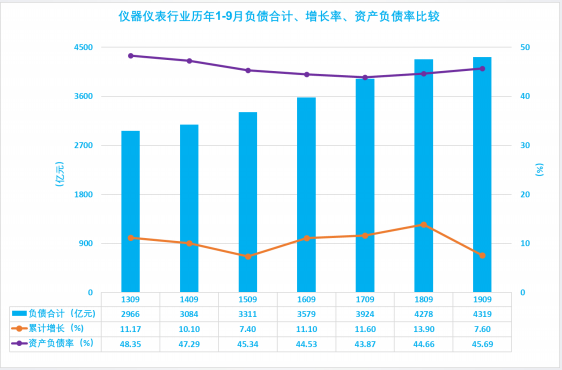 2.10 儀器儀表行業(yè)歷年1-9月負(fù)債合計、增長率、資產(chǎn)負(fù)債率比較