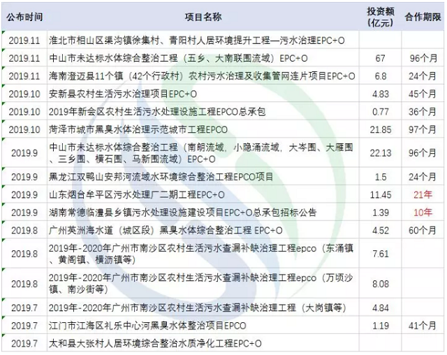 事實(shí)上,這只是EPCO類水環(huán)境項(xiàng)目的高光時(shí)刻,近期出現(xiàn)的同類項(xiàng)目已小有氣候,還有一波未開啟招標(biāo)的也正在趕來的路上。近期典型水環(huán)境EPCO項(xiàng)目如下表所示: